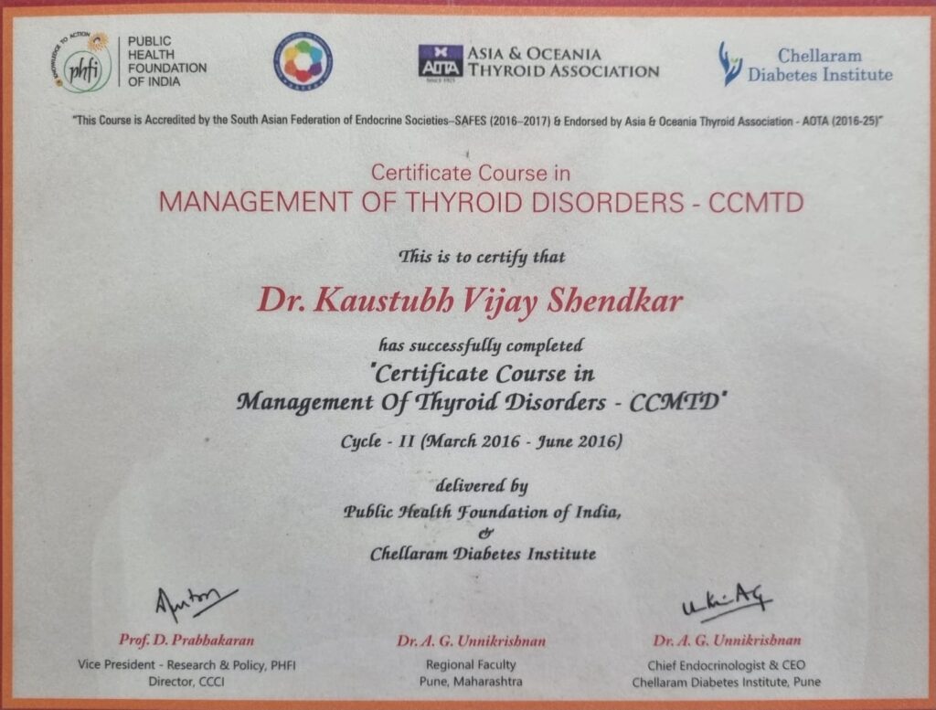 He also has special interest in management of thyroid disorders and has completed a certificate course in management of thyroid disorders (CCMTD).