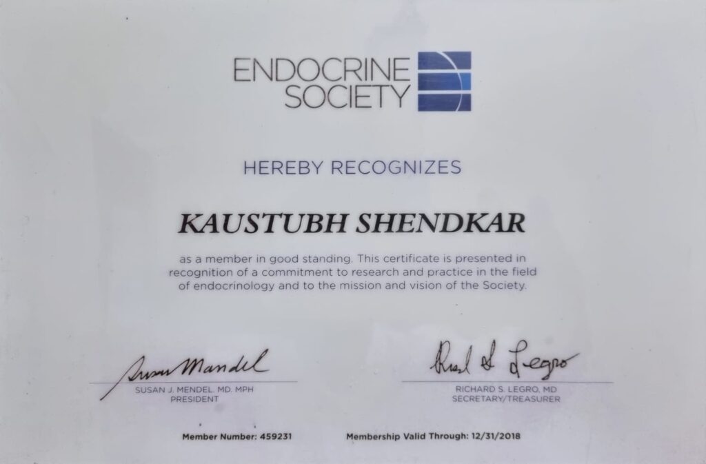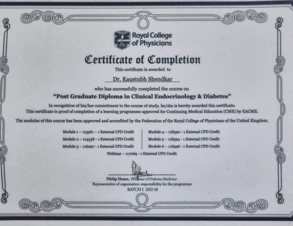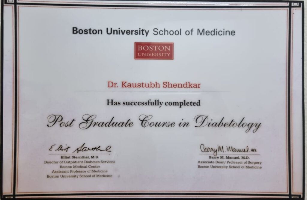 He has got certificate in Diabetes from Boston university (Post Graduate Course in Diabetology) and from Royal College of Physicians United Kingdom (Post graduate diploma in Clinical Endocrinology and Diabetes).